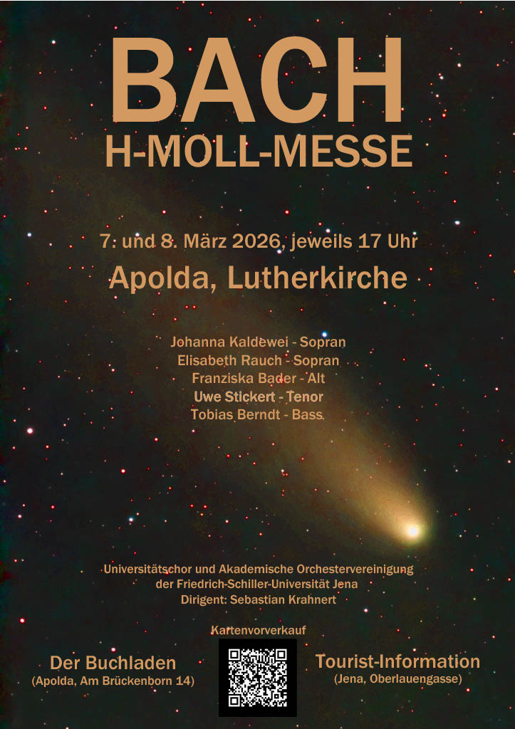 Die h-Moll-Messe von Johann Sebastian Bach wird am 7. und 8. März 2026 jeweils um 17 Uhr in der Lutherkirche Apolda aufgeführt. Es musizieren der Universitätschor und die Akademische Orchestervereinigung der Friedrich-Schiller-Universität Jena unter der Leitung von Sebastian Krahnert. Als Solisten wirken Johanna Kaldewei, Elisabeth Rauch, Franziska Bader, Uwe Stickert und Tobias Berndt mit.