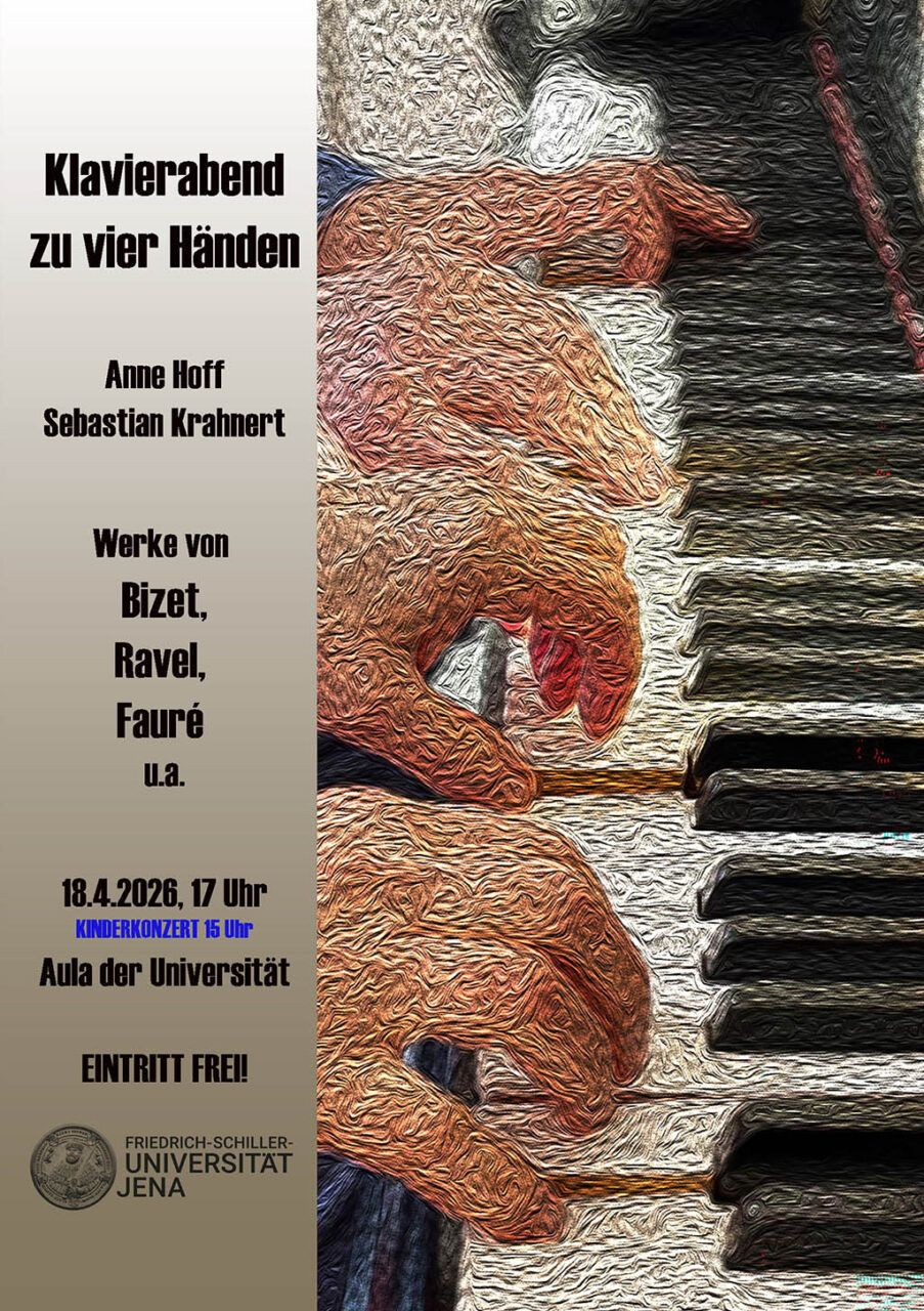 Am Samstag, den 18. April 2026, erwartet Musikliebhaberinnen und Musikliebhaber in Jena ein besonderes Konzerterlebnis mit zwei aufeinander abgestimmten Veranstaltungen. Um 15 Uhr beginnt ein Kinderkonzert unter dem Titel „Musikalische Kinderspiele“, gefolgt von einem Klavierabend zu vier Händen um 17 Uhr. Beide Konzerte werden von den Pianisten Anne Hoff und Sebastian Krahnert gestaltet und richten sich sowohl an junge Zuhörer als auch an ein erwachsenes Publikum. Der Eintritt ist frei.