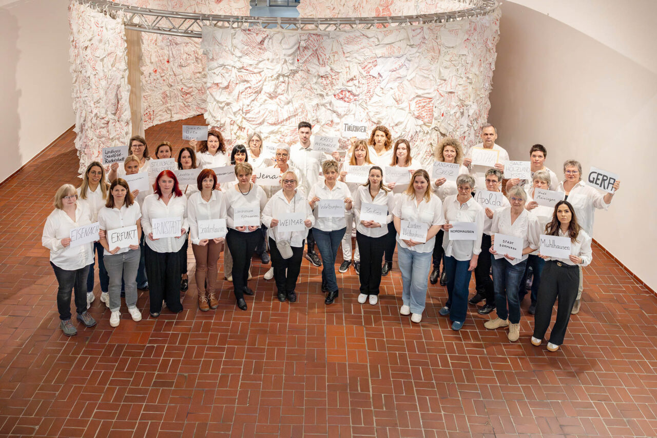 Mit einer landesweiten Aktion haben die Thüringer Gleichstellungsbeauftragten gemeinsam mit der Landesgleichstellungsbeauftragten Nadja Sthamer ein sichtbares Zeichen gegen Gewalt und Diskriminierung von Frauen gesetzt. Anlass ist die Ausstellung „WOMEN IN THE DARK – aufruhr des schweigens“ in der Kunsthalle Erfurt. Ziel der Initiative ist es, auf strukturelle Gewalt aufmerksam zu machen, Betroffene zu stärken und gesellschaftliche Verantwortung einzufordern.