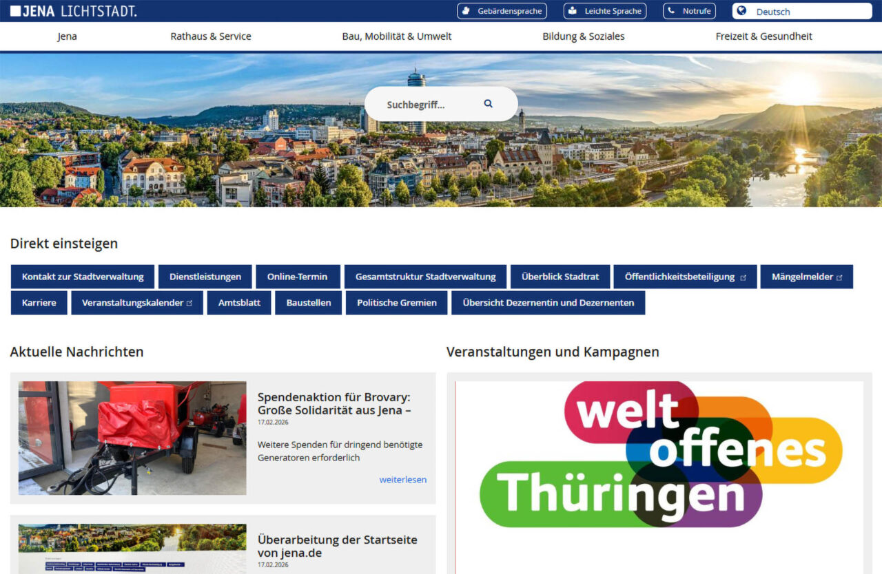 Die Stadt Jena hat die Startseite ihres offiziellen Internetauftritts jena.de grundlegend überarbeitet. Ziel der Neugestaltung ist es, Bürgerinnen und Bürgern sowie weiteren Nutzergruppen einen schnelleren, übersichtlicheren und thematisch klar strukturierten Zugang zu den zentralen Informationen der Stadtverwaltung zu ermöglichen.